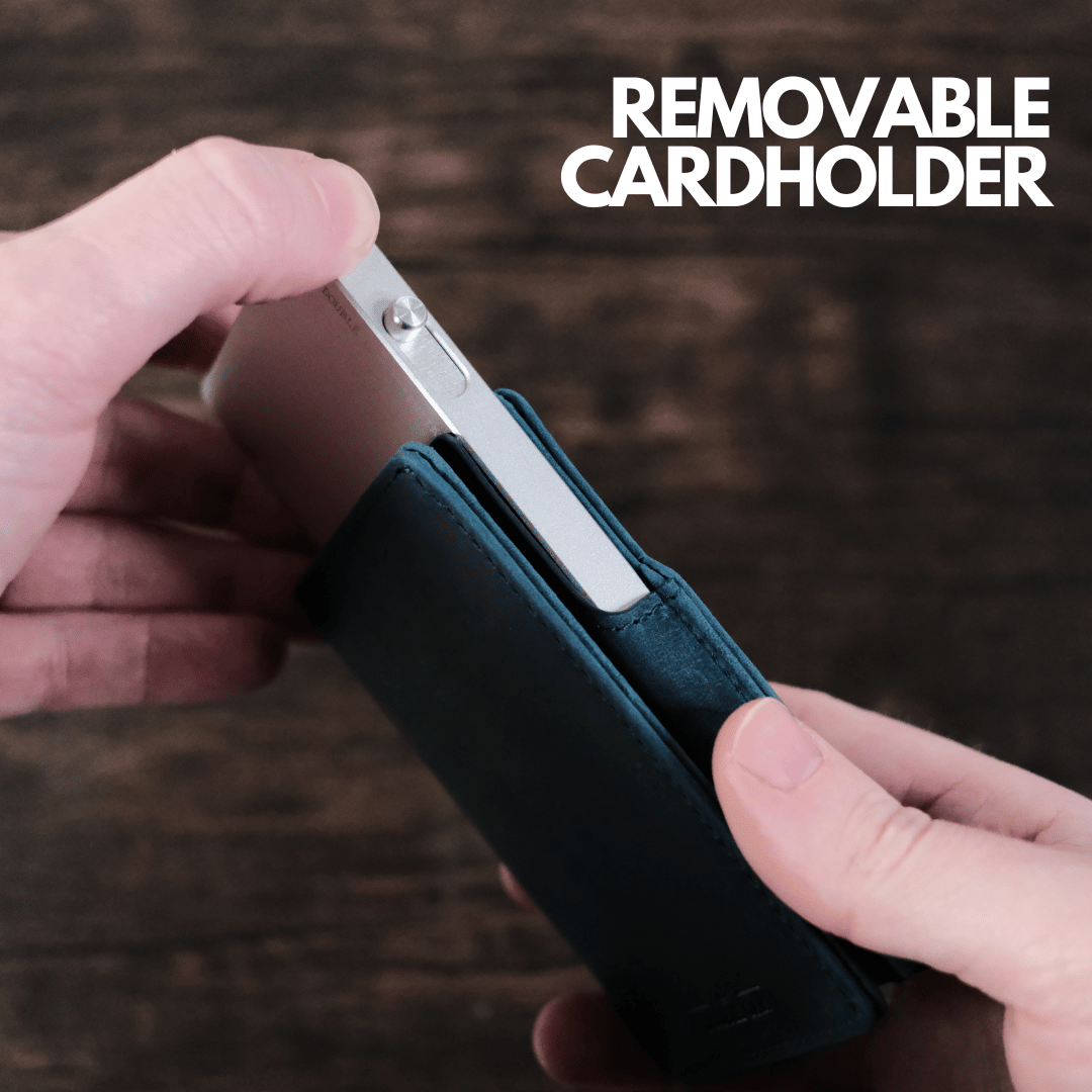 The removable card holder, a game-changer in slim wallets, holds 7 cards flat – one more than traditional pop-up card holders. Customize your style and simplify your carry by effortlessly detaching the card holder. Interchange colors with different top-grain leather and card holder options for a truly personalized experience.