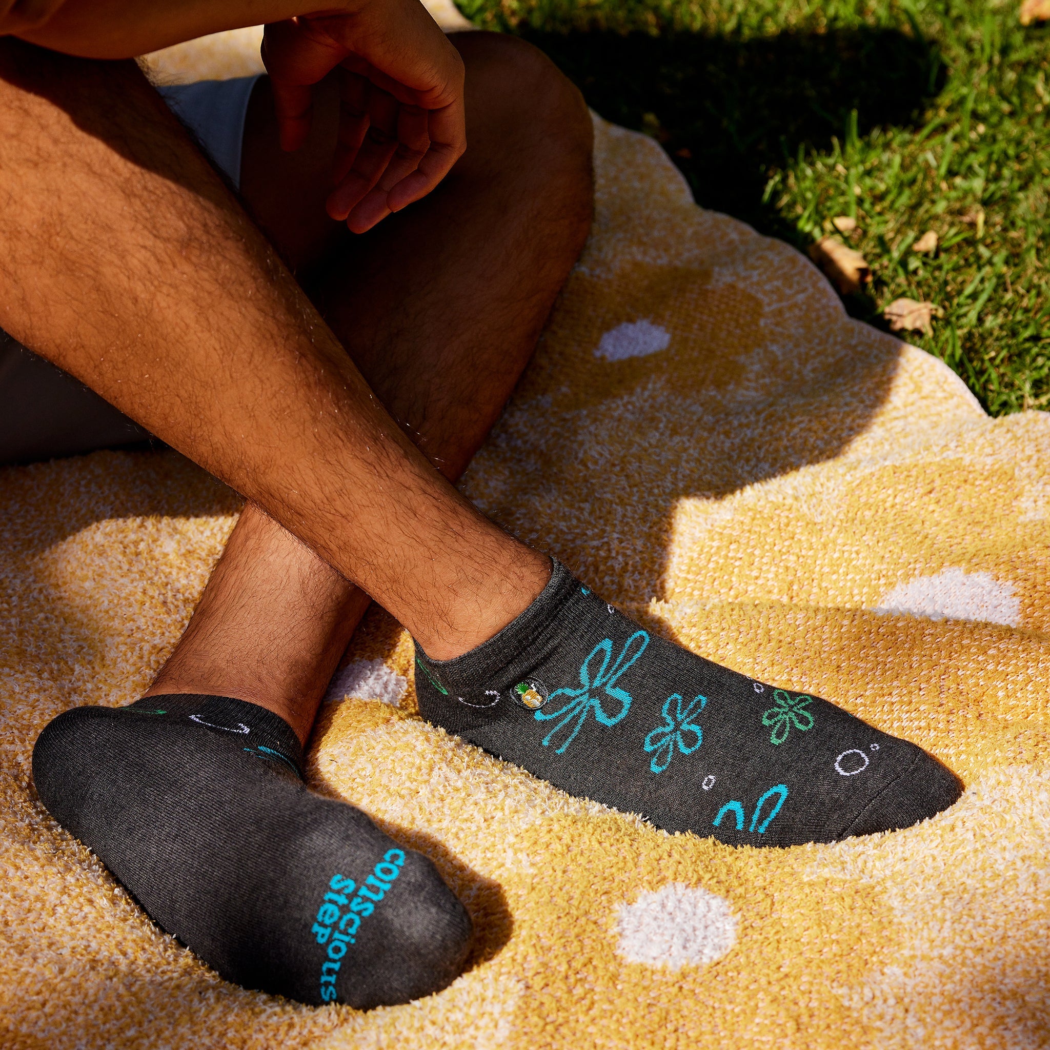 Make any day the best day ever in the ankle version of our iconic SpongeBob blue and green flower clouds on gray socks. Let us know if you take them jellyfishing!