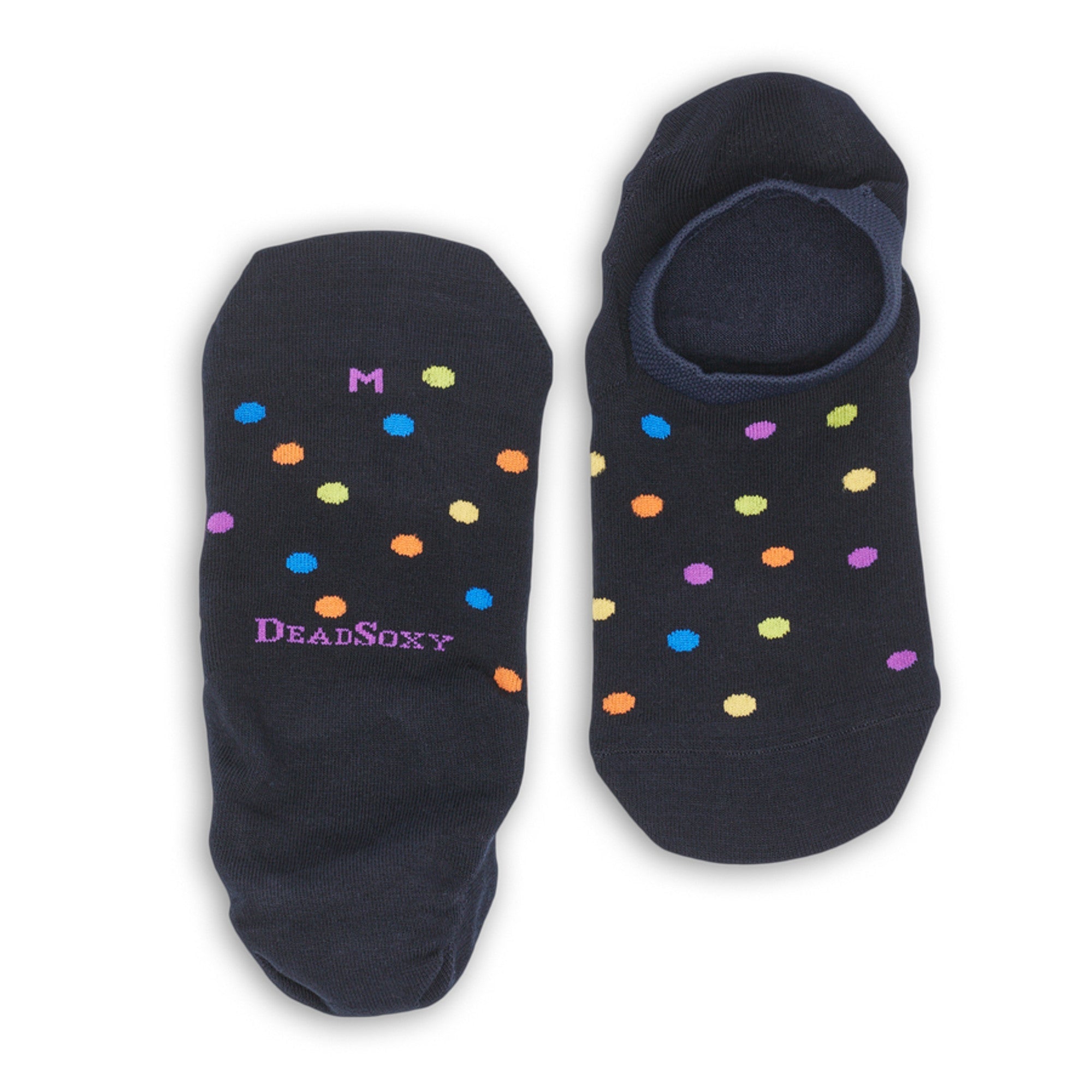 The Willie is a navy blue no show sock with multiple color dots. These no shows are fun and subtle at the same time.